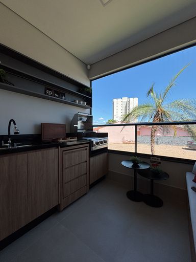 ▫ Varanda com bancada em granito, cuba inox e ponto de gás